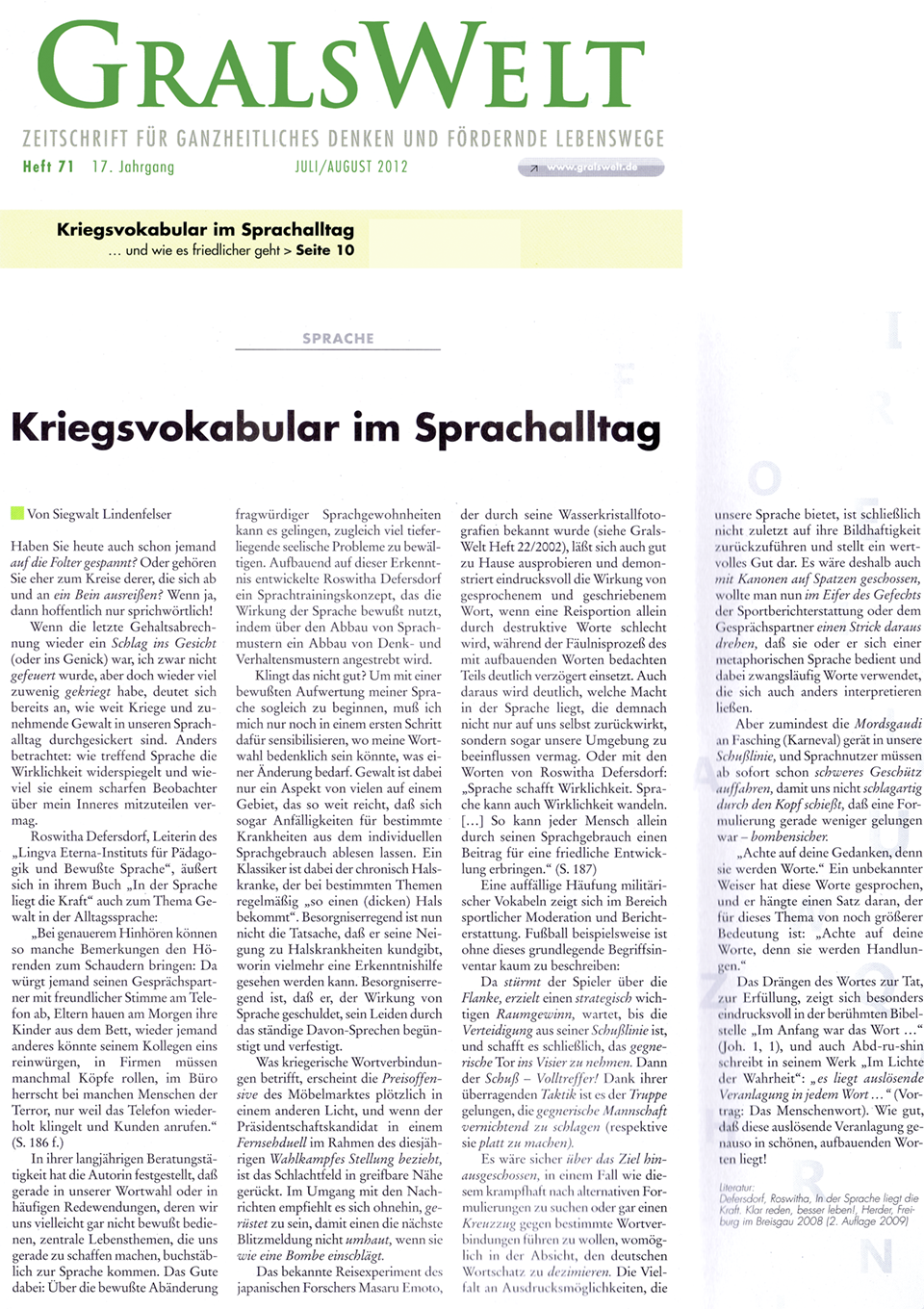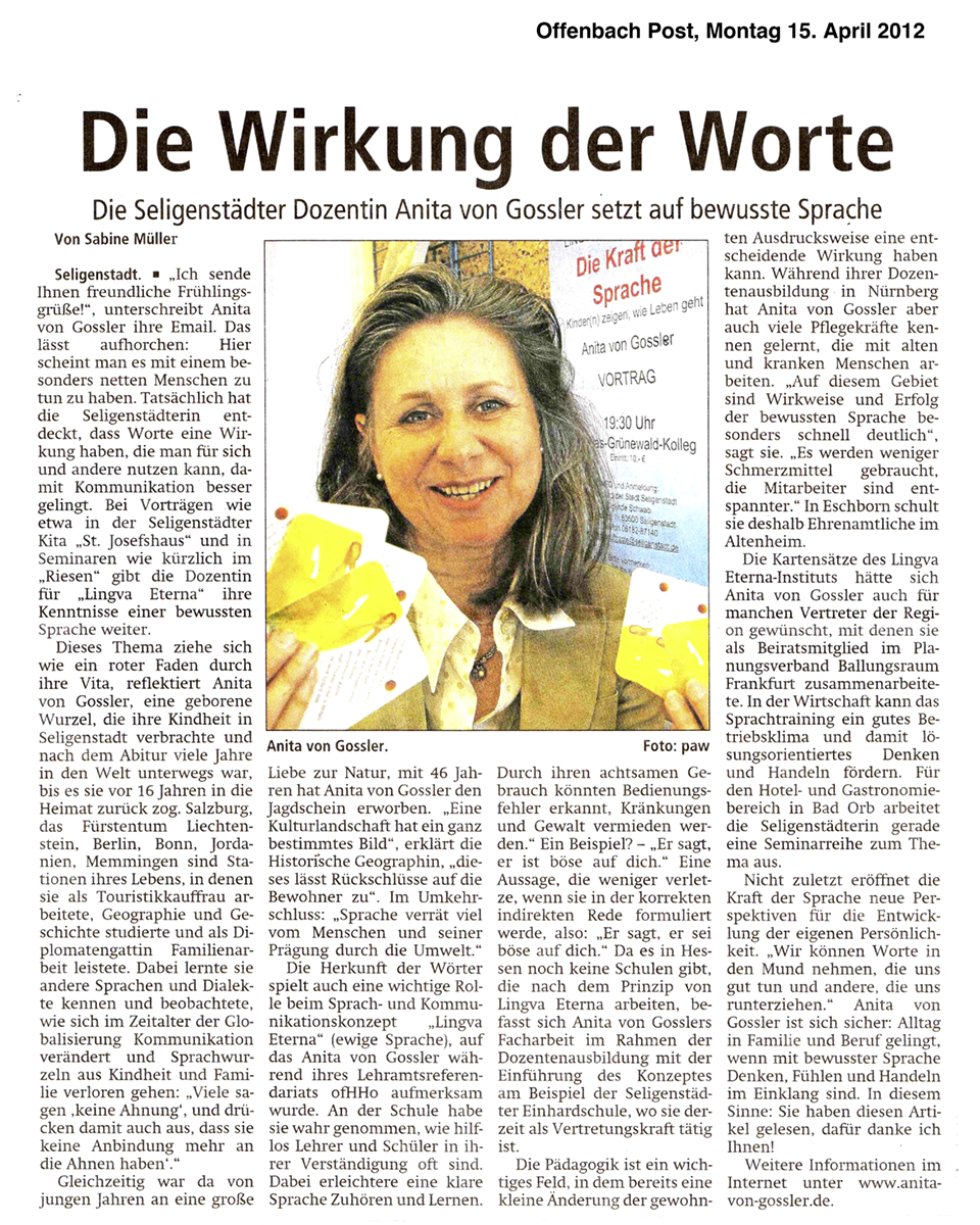 Als ich das Seminar begann, dachte ich, es sei einmal eine nette Abwechslung. Ich habe nicht geahnt, welche Dimensionen sich mir eröffnen. In meinem Leben hat sich vieles gewandelt und vieles geht viel leichter als vorher. Ich habe mich schon für das nächste Seminar angemeldet. (Frau F., Versicherungsangestellte, September 2011)